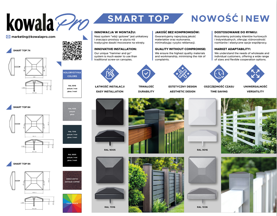 Nasze flagowe rozwiązanie to SmartTop – innowacyjny aluminiowy daszek z gwoździem to efekt wieloletniego doświadczenia i pracy naszego zespołu projektowego. Produkt został zaprojektowany tak, aby chronić drewniane słupki przed działaniem wody i promieni UV, a jednocześnie skracać czas montażu do kilku sekund – wystarczy młotek, bez wkrętów i wiercenia.